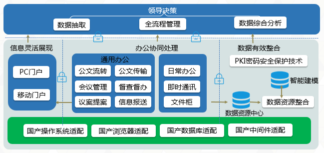 产品简介吉大正元政务办公体系是针对政府的办文、办事、办会等业务,实现符合政府业务特色的全流程全链条管理。采取密码技术和国产化环境适配等措施,确保电子政务网络和业务应用系统的安全合规,实现电子政务建设安全保障。对产生的数据进行整合进行集中管理,结合人工智能技术,为办公人员提供智慧办公环境,为领导决策提供科学化依据,实现管理水平的提高。