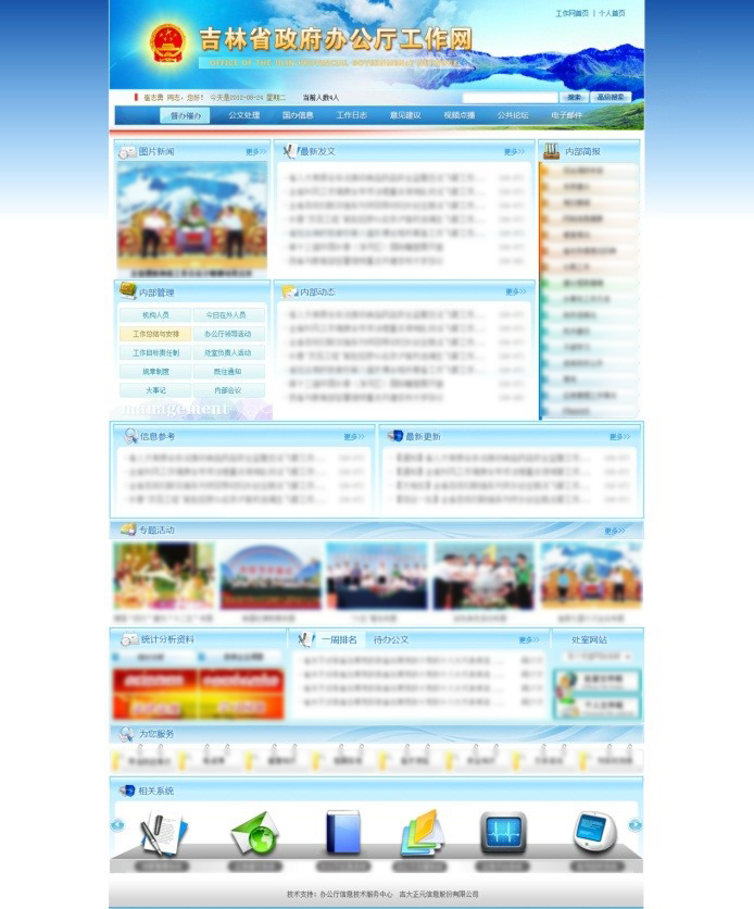 吉林省政府工作网于2001年开始建设,2012年升级改版。实现业务信息资源门户整合。并且实现“统一门户”、“统一支撑”、“统一审计”、“统一认证”。