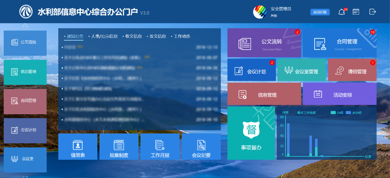 水利部信息中心于2015年开始进行升级改版,通过构建多云节点分布式管理模式,支持多机构共同使用,机构间既相互独立,也互联互通。应用密码技术,实现移动端证书认证。率先使用东方通和WPS,实现办公国产化。