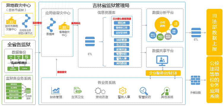 应用场景吉林省监狱大数据平台,是在司法部推行智慧监狱建设的背景下,参照《关于加快推进“智慧监狱”建设的实施意见》、《智慧监狱数据规范》、《智慧监狱技术规范》、《智慧监狱验收细则》等政策技术文件,通过对监狱现状和问题分析,对全省19家监狱及省局11套业务系统进行规划及梳理,按照“一数一源”原则,实现了全省数据的集中管理和深入挖掘,构建了罪犯、警察、监狱管理3大基础库及11个业务主题库,实现了各业务系统间的实时数据交换,实现了监狱与公检法等外部门的数据交换,通过构建数据仓库,实现了罪犯改造行为异常变化评估、警察执法精准性评估等12个模型,为监狱管理分析研判提供有利支撑,充分满足智慧监狱验收要求。通过异地容灾和备份实现了全省19家监狱及省局11套业务系统的应用容灾及数据备份,有效解决监狱由于设备老化、系统宕机引起的业务中断及数据丢失问题,保障了数据安全。