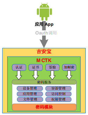 吉安宝调用密码模块提供的SKF 接口完成证书管理、认证、签验、加解密等功能,应用App 通过 Oauth 协议和吉安宝通讯,完成单点认证。