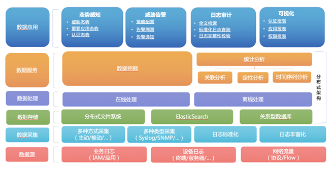 建设全面、完整的日志审计手段和机制,构建全面的单位网络安全日志审计与分析体系。采用机器学习、大数据等技术,实现对海量日志数据的监控、分析、预警、预测、挖掘等功能,满足单位业务安全日志审计与分析需求。